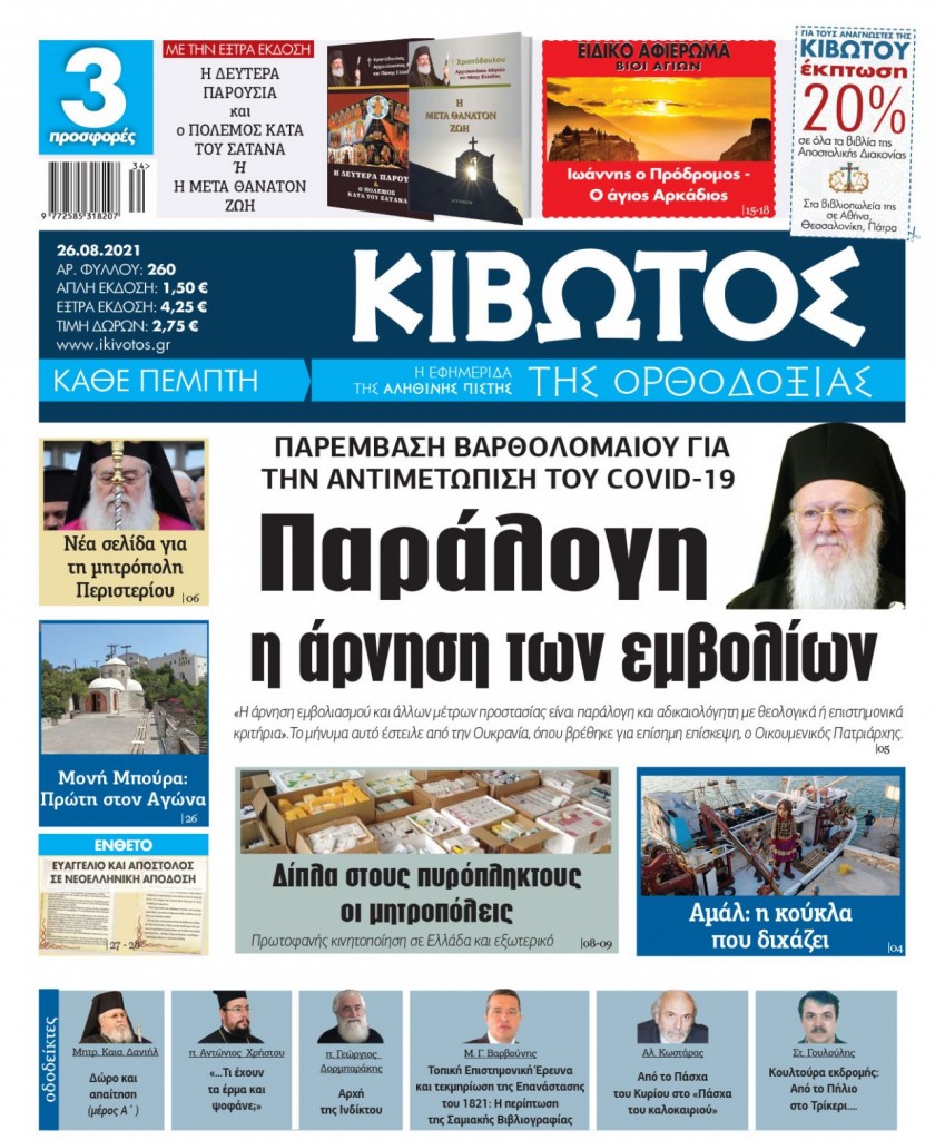 Την Πέμπτη, 26 Αυγούστου 2021, κυκλοφορεί το νέο φύλλο της Εφημερίδας «Κιβωτός της Ορθοδοξίας»