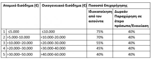 – Σε περίπτωση που η χρήση κατοικίας γίνεται από τον αιτούντα (ιδιοκατοίκηση), το ποσοστό επιχορήγησης είναι κλιμακωτό ανά εισοδηματική κατηγορία.