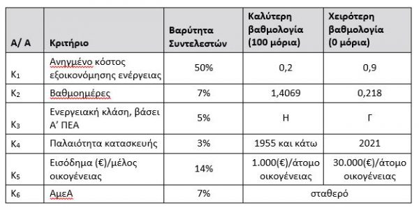 - Η εκτιμώμενη ετήσια εξοικονόμηση ενέργειας βάσει του προτεινόμενου κόστους παρεμβάσεων θα αποτελέσει το σημαντικότερο κριτήριο σε ποσοστό 50% και ακολουθεί το ατομικό ή οικογενειακό εισόδημα σε ποσοστό 15%.