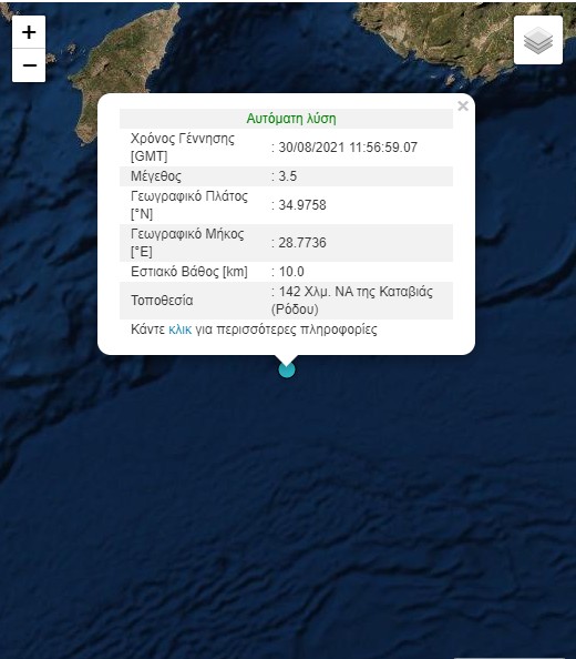 Σύμφωνα με την Γεωδυναμικό Ινστιτούτο η δόνηση προσδιορίζεται, 142 χιλιόμετρα Νοτιοανατολικά της Κατταβιάς Ρόδου και το εστιακό της βάθος είναι 10 χιλιόμετρα.
