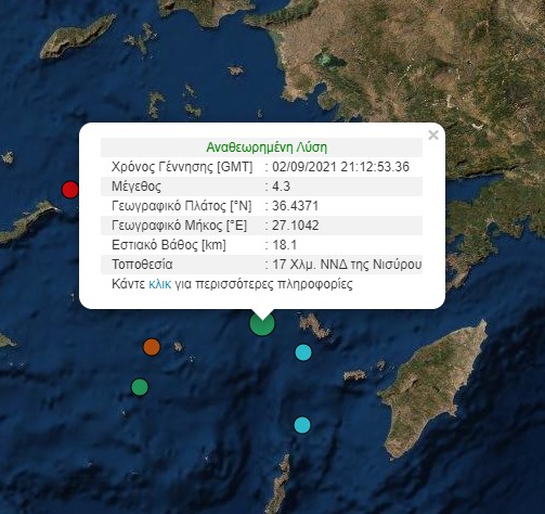 Σεισμική δόνηση 4,3 βαθμών της κλίμακας Ρίχτερ σημειώθηκε λίγο μετά τα μεσάνυχτα της Παρασκευής 17χλμ νότια, νοτιοδυτικά της Νισύρου.