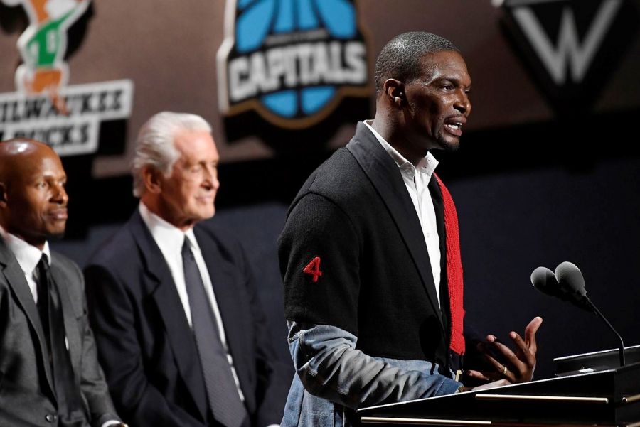 Υπό το βλέμμα των καλών του φίλων και άλλοτε συμπαικτών του, Λεμπρόν Τζέιμς και Ντουέιν Γουέιντ, ο Κρις Μπος αναφέρθηκε στον Πατ Ράιλι και στο ένα δαχτυλίδι πρωταθλητή που του έδωσε ο πρόεδρος των Μαϊάμι Χιτ μέχρι να κατακτήσει ένα με την ομάδα της Φλόριντα. Ένα δαχτυλίδι που του το επέστρεψε στην τελετή, αφού με το Μαϊάμι κατέκτησε δύο πρωταθλήματα.