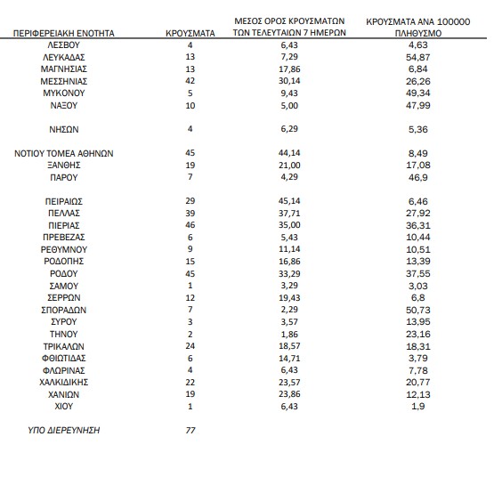 Ακόμα, 56 κρούσματα καταγράφει η Αχαΐα, 50 η Ημαθία, 46 η Πιερία, 45 η Ρόδος, 44 η Λάρισα και 42 η Μεσσηνία.