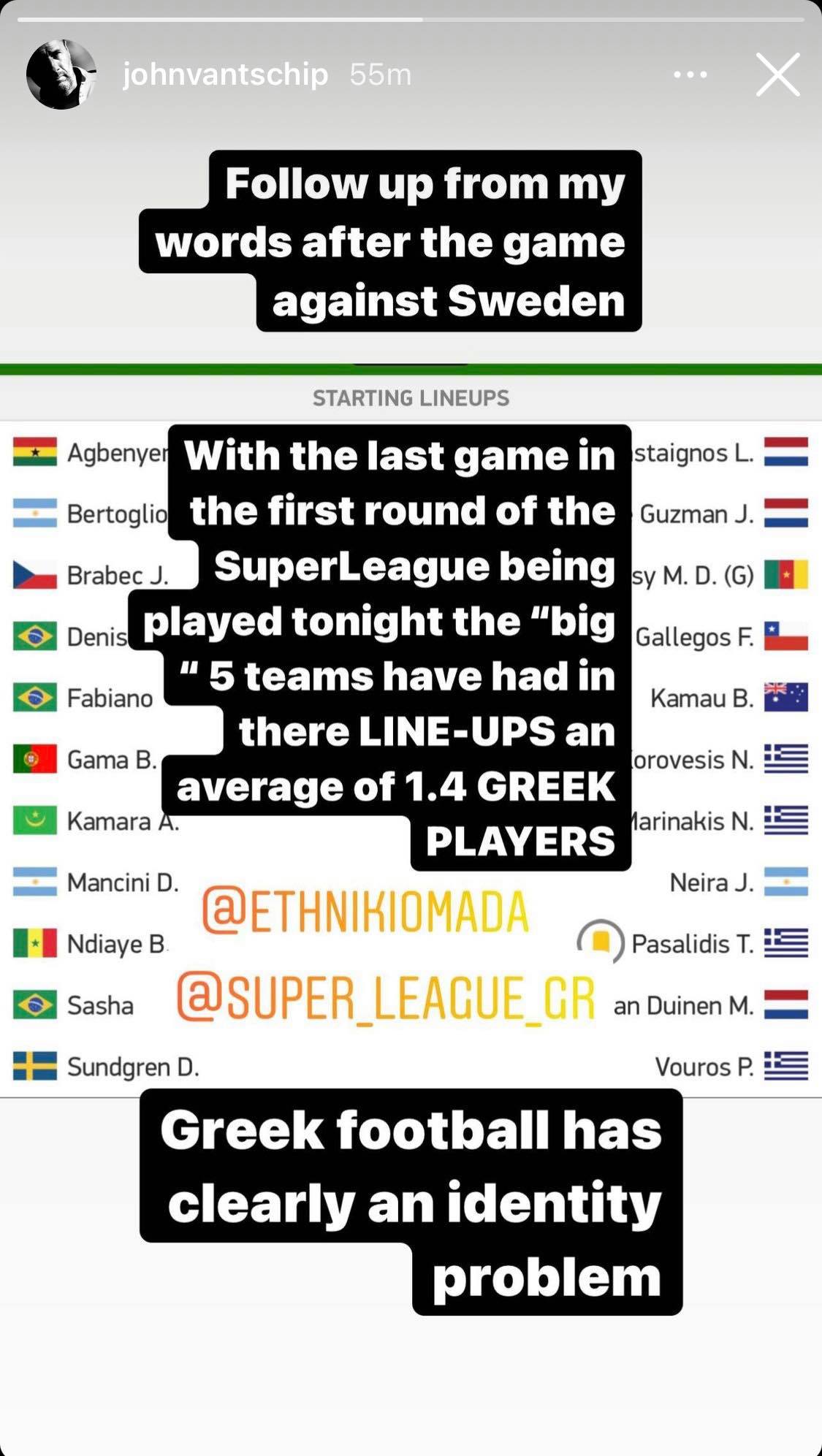 «Σε συνέχεια των δηλώσεων μου μετά το παιχνίδι με τη Σουηδία. Μετά και το τελευταίο παιχνίδι της 1ης αγωνιστικής της Super League οι Big-5 έχουν χρησιμοποιήσει στις ενδεκάδες τους κατά μέσο όρο 1,4 Έλληνες ποδοσφαιριστές. Το ελληνικό ποδόσφαιρο έχει πρόβλημα ταυτότητας», ανέφερε ο Ομοσπονδιακός προπονητής στο Instagram.