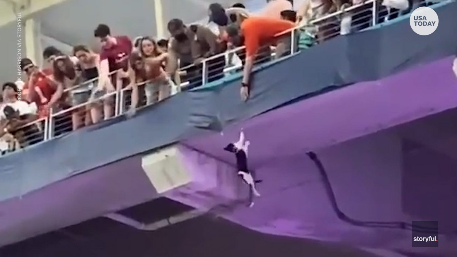 Χρησιμοποιώντας την αμερικάνικη σημαία, οι φιλάθλοι κατάφεραν να σώσουν τη γάτα, η οποία κρεμόταν με τα νύχια της από τον τοίχο, ενώ οι πανηγυρισμοί που ακολούθησαν αποδεικνύουν πως αφενός ακόμη δεν έχει χαθεί η αίσθηση ανθρωπιάς σε αυτόν τον πλανήτη, αφετέρου πως αν και οι σημαίες πολλές φορές μας έχουν διχάσει ή ακόμη και τρομάξει, ωστόσο υπάρχουν και φορές που μας ενώνουν. Όπως αυτη!