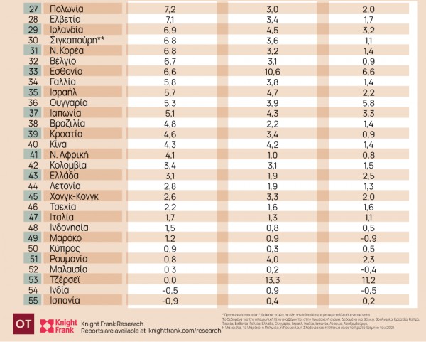 Σημειώνεται ότι σύμφωνα με την Knight Frank τα στοιχεία των αυξήσεων για Βέλγιο, Βουλγαρία, Κροατία, Κύπρο, Τσεχία, Εσθονία, Γαλλία, Ελλάδα, Ουγγαρία, Ισραήλ, Ιταλία, Ιαπωνία, Λετονία, Λουξεμβούργο, Μαλαισία, Μαρόκο, Πολωνία, Ρουμανία, Σλοβενία και Ισπανία αφορούν το 1ο τρίμηνο του 2021. Για όλες τις άλλες χώρες αφορούν το 2ο τρίμηνο του ίδιου έτους.