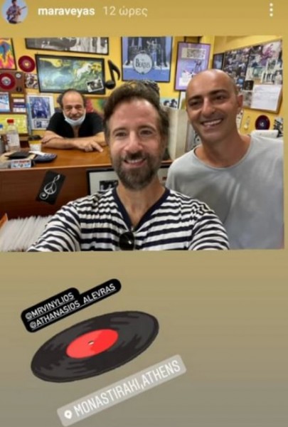 Το στιγμιότυπο ανέβασε ο ίδιος ο Κωστής Μαραβέγιας λίγο μετά το τέλος του γυρίσματος σε ένα παλιό δισκοπωλείο στο Μοναστηράκι με συλλεκτικούς δίσκους βινυλίου.