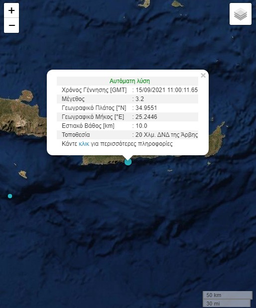 Σεισμός της τάξης των 3,2 Ρίχτερ έγινε στο Ηράκλειο Κρήτης το μεσημέρι της Τετάρτης. Σύμφωνα με το Γεωδυναμικό Ινστιτούτο, το εστιακό βάθος ήταν μόλις στα 10 χιλιόμετρα. Το επίκεντρο του σεισμού ήταν στα 20 χιλιόμετρα δυτικά – νοτιοδυτικά του χωριού Άρβη.
