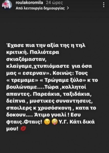 Σκληρή τοποθέτηση για τις τηλεκριτικές του χθες και του σήμερα έκανε μέσα από τα social media η Ρούλα Κορομηλά.