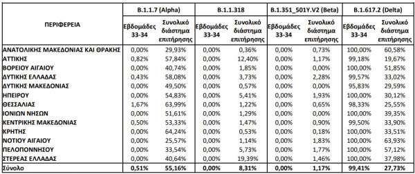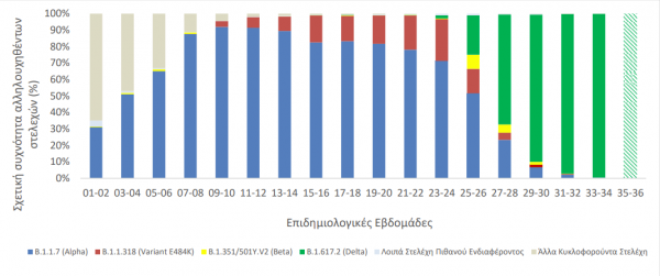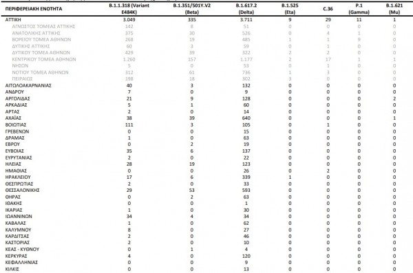 Από τα δείγματα αυτά, 42,66% αφορούν στο B.1.1.318 (Variant E484K), 29,73% στο Delta, 15,50% στο Alpha, 6,55% στο Beta, 0,13% στο C.36 και 0,10% στο Gamma.