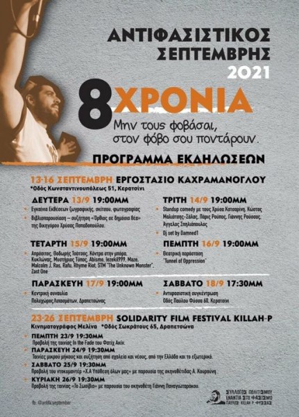 *Σε όλες τις εκδηλώσεις του Αντιφασιστικού Σεπτέμβρη θα λαμβάνονται μέτρα συλλογικής αυτοπροστασίας για την Covid-19.