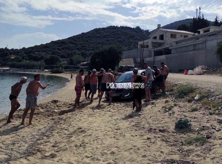 Το αυτοκίνητο δεν σταμάτησε στην αμμουδιά της παραλίας, αλλά βρέθηκε μέσα στο νερό. Όπως μπορείτε να δείτε και στην παρακάτω φωτογραφία, με την παρέμβαση των λουόμενων το αυτοκίνητο τραβήχτηκε προς τα έξω.