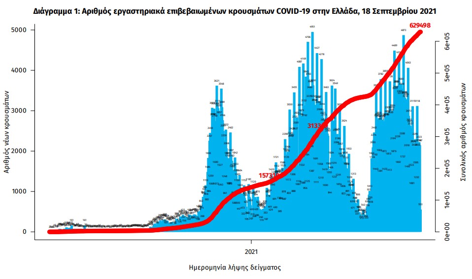 Τα νέα εργαστηριακά επιβεβαιωμένα κρούσματα της νόσου που καταγράφηκαν τις τελευταίες 24 ώρες είναι 2.190, εκ των οποίων 18 εντοπίστηκαν κατόπιν ελέγχων στις πύλες εισόδου της χώρας. Ο συνολικός αριθμός των κρουσμάτων ανέρχεται σε 629.498 (ημερήσια μεταβολή +0.3%), εκ των οποίων 51.0% άνδρες.