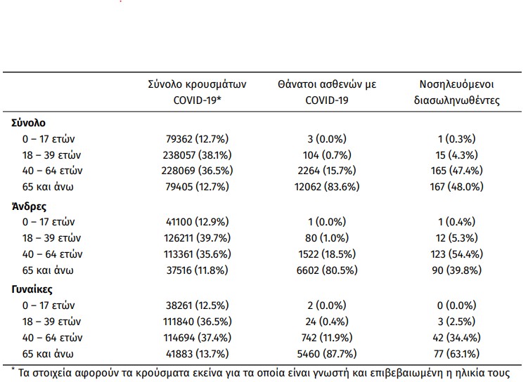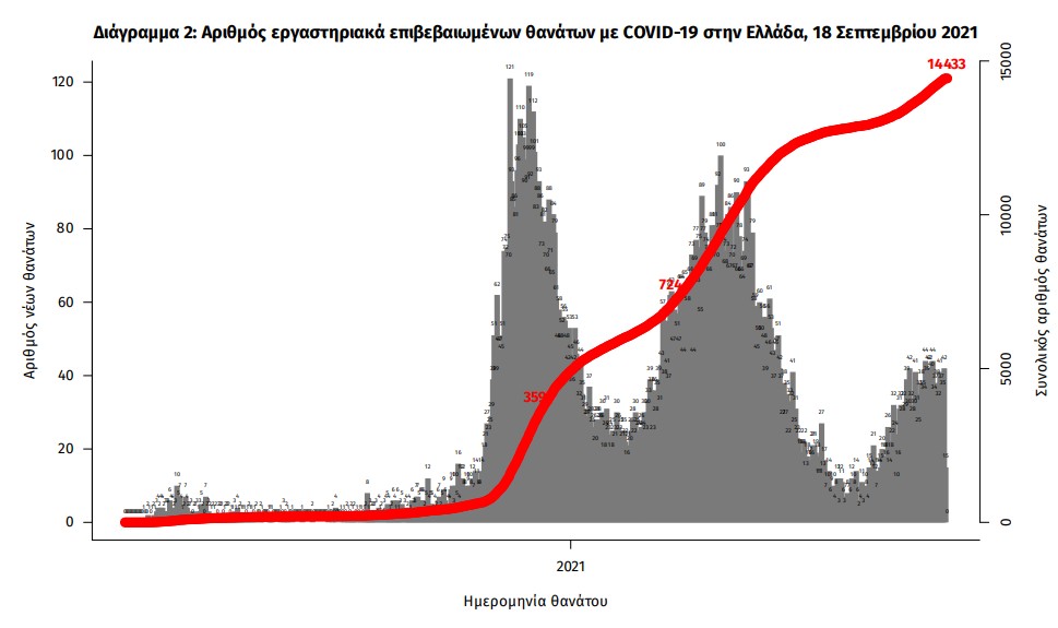Οι νέοι θάνατοι ασθενών με COVID-19 είναι 37, ενώ από την έναρξη της επιδημίας έχουν καταγραφεί συνολικά 14.433 θάνατοι. Το 95.4% είχε υποκείμενο νόσημα ή/και ηλικία 70 ετών και άνω.