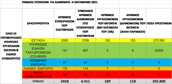 Ήδη, σύμφωνα με τα επίσημα στοιχεία του ΣΕΠΕ, κατά την περίοδο Ιανουαρίου-Αυγούστου 2021, διενεργήθηκαν πανελλαδικά 2.458 έλεγχοι που αφορούσαν στους όρους εργασίας 4.411 διανομέων.