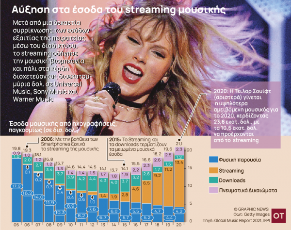 Η μουσική βιομηχανία ανακάμπτει το 2021, με άνοδο στα έσοδα από τις πωλήσεις CD και βινυλίου – που δέχθηκαν πλήγμα το 2020 λόγω των lockdown στη λιανική πώληση από την πανδημία – και με αύξηση των συνδρομητών σε υπηρεσίες streaming, που έχει γίνει η κύρια πηγή εσόδων για τους καλλιτέχνες και τις δισκογραφικές εταιρίες εν μέσω της πανδημίας του κορωνοϊού.