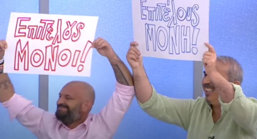 Αυτό στάθηκε αφορμή για τους συνεργάτες της, Βαγγέλη Περρή και Γρηγόρη Μπάκα να… σηκώσουν πλακάτ «Επιτέλους μόνη», με την παρουσιάστρια να λέει: