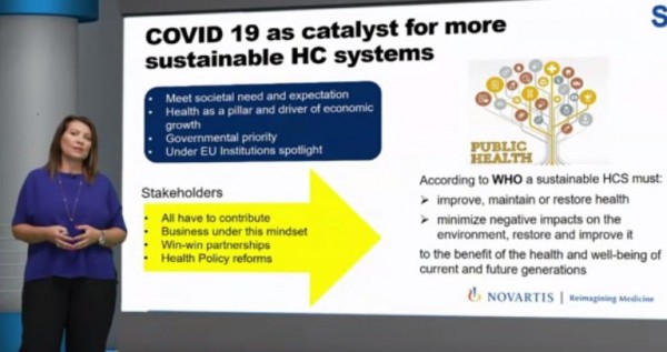 Η επικεφαλής του Τμήματος Επικοινωνίας Φωτεινή Μπαμπανάρα, υπογράμμισε ότι η Novartis Hellas έχει ενσωματώσει τα κριτήρια βιώσιμης ανάπτυξης σε όλο το φάσμα των δραστηριοτήτων της. Η εταιρία στοχεύει στην απελευθέρωση των ταλέντων των εργαζομένων της, αλλά και στην ισορροπία προσωπικής και επαγγελματικής ζωής, εξαλείφοντας ταυτόχρονα τα μισθολογικά χάσματα μεταξύ ανδρών και γυναικών. Μάλιστα οι τελευταίες καταλαμβάνουν το 60% των θέσεων ευθύνης της ελληνικής θυγατρικής. Στη διάρκεια του lockdown, η εταιρεία χρηματοδότησε μέσα από διάφορες ψηφιακές πλατφόρμες την επιμόρφωση των εργαζομένων της σε θέματα ενδιαφέροντός τους, όπως η συναισθηματική νοημοσύνη κλπ.
