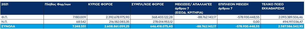 Ο κύριος φόρος των φυσικών προσώπων ανέρχεται σε 2,39 δισ. ευρώ και ο συμπληρωματικός που εξετάζεται είτε να καταργηθεί μελλοντικά είτε να ενσωματωθεί στον κυρίως ΕΝΦΙΑ διαμορφώθηκε σε 368 εκατ. ευρώ, σύνολο 3,25 δισεκατομμύρια ευρώ, ενώ για τα νομικά πρόσωπα ο κύριος φόρος είναι 216 εκατ. ευρώ και ο συμπληρωματικός 278 εκατ. ευρώ.