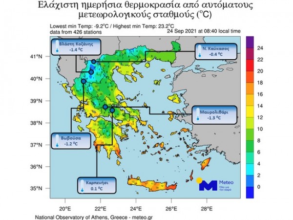 Με βάση τα στοιχεία από το δίκτυο των αυτόματων μετεωρολογικών σταθμών του Εθνικού Αστεροσκοπείου Αθηνών/meteo.gr, παγετός σημειώθηκε στη Δυτική Μακεδονία και την Ήπειρο, με τη θερμοκρασία στη Βλάστη Κοζάνης να πέφτει στους -1,4 ⁰C, ενώ αρνητικές ήταν, επίσης, οι θερμοκρασίες σε Μαυρολιθάρι (μείον 1,3), Βωβούσα (μείον 1,2), Νέο Καύκασο (μείον 0,4) κ.ά.