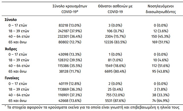 Οι νέοι θάνατοι ασθενών με COVID-19 είναι 33, ενώ από την έναρξη της επιδημίας έχουν καταγραφεί συνολικά 14.639 θάνατοι. Το 95.4% είχε υποκείμενο νόσημα ή/και ηλικία 70 ετών και άνω.