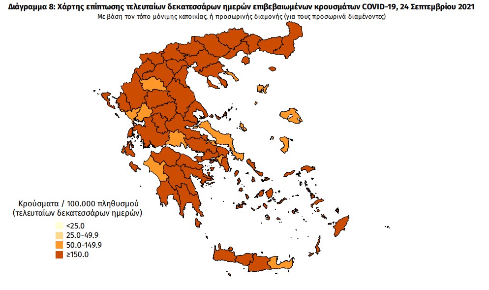 Με βάση τα επιβεβαιωμένα κρούσματα των τελευταίων 7 ημερών, 128 θεωρούνται σχετιζόμενα με ταξίδι από το εξωτερικό και 3.487 είναι σχετιζόμενα με ήδη γνωστό κρούσμα.