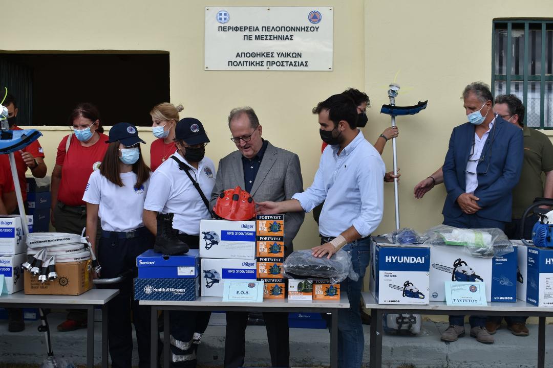 Ειδικότερα, υλικά και εξοπλισμό παρέλαβαν ο Φυσιολατρικός Πολιτιστικός Εξωραϊστικός Εθελοντικός Σύλλογος Λεύκτρου Μάνης “Γαία”, το παράρτημα Μεσσηνίας της Ελληνικής Ομάδας Διάσωσης (ΕΟΔ), οι Φίλοι του Ταΰγετου, η Ομάδα Πυροπροστασίας «Η Δημιοβίτισσα», η ΟΑΚ (Ομάδα Αντιμετώπισης Καταστροφών) 4×4 Μεσσηνίας και η Εθελοντική Ομάδα Δασοπυροσβεστών και Φυσικών Καταστροφών Βασιλιτσίου.