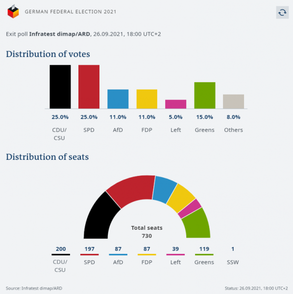 Το πρώτο exit poll θέλει τον Όλαφ Σόλτς και τον Άρμιν Λάσετ να βρίσκονται ισόπαλοι στην πρώτη θέση με 25%. Ακολουθούν οι Πράσινοι με 15%.