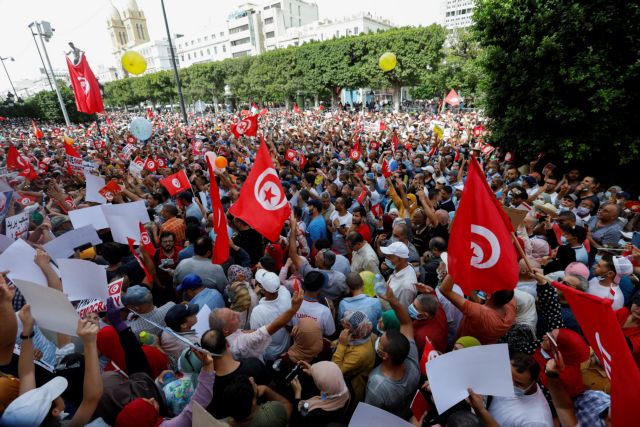 Χιλιάδες Τυνήσιοι κατέκλυσαν σήμερα τους δρόμους της πρωτεύουσας Τύνιδας για να διαδηλώσουν κατά του προέδρου Κάις Σάγεντ, που έλαβε μέτρα για να ενισχύσει την εξουσία του.
