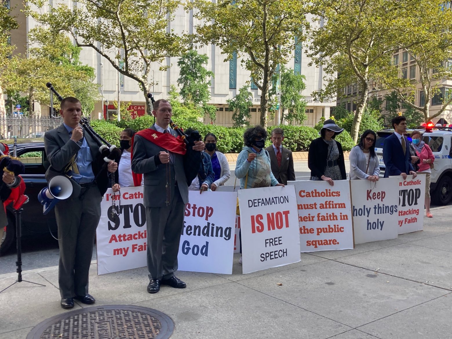 «Καταδικάζουμε απερίφραστα τη βλάσφημη λεσβιακή ταινία Benedetta που προσβάλλει την ιερότητα των καθολικών μοναχών», έγραφε ένα πλακάτ.