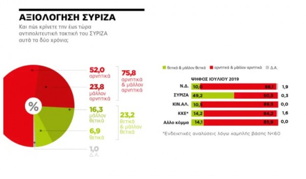 Από την άλλη, ο ΣΥΡΙΖΑ εξακολουθεί να έχει πρόβλημα με την αποδοχή της αντιπολιτευτικής του τακτικής αυτή τη διετία. Μια τακτική, που εγκρίνεται από το 23,2% («θετικά» 6,9%, «μάλλον θετικά» 16,3%). Αντιθέτως, το 75,8% απαντά «αρνητικά και μάλλον αρνητικά», με τους ψηφοφόρους του ΣΥΡΙΖΑ μάλιστα να την απορρίπτουν σε ποσοστό 50,5%.