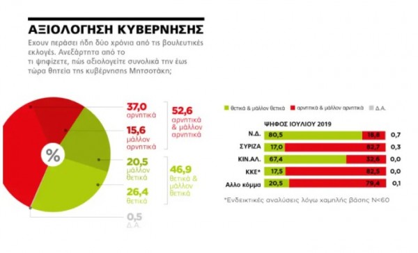 Στη συνολική αξιολόγηση της κυβέρνησης αυτά τα δύο χρόνια, «θετικά και μάλλον θετικά» απαντά το 46,9%, ενώ «αρνητικά και μάλλον αρνητικά» το 52,6%.
