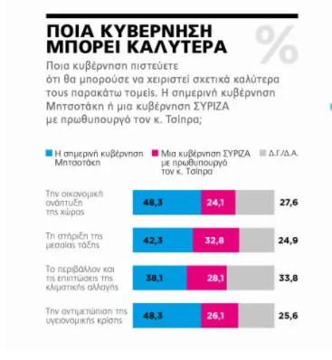 Για τη στήριξη της μεσαίας τάξης, η ΝΔ έχει τη θετική άποψη από το 42,3% και ο ΣΥΡΙΖΑ από το 32,8%.