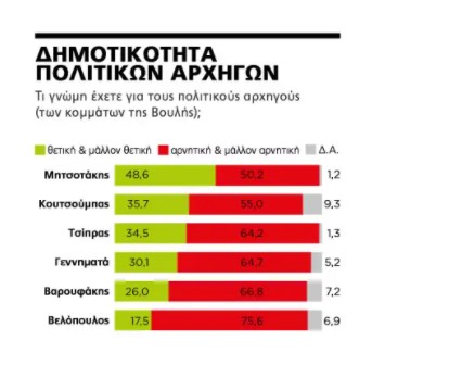 Στις δημοτικότητες, ο Κυριάκος Μητσοτάκης συγκεντρώνει ποσοστό 48,6%, ο Δημήτρης Κουτσούμπας έρχεται δεύτερος με 35,7%, ακολουθεί ο Αλέξης Τσίπρας με 34,5%, η Φώφη Γεννηματά με 30,1%, ο Γιάνης Βαρουφάκης με 26% και ο Κυριάκος Βελόπουλος με 17,5%.