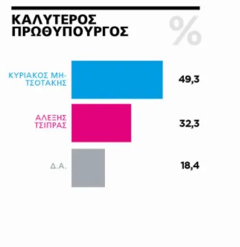 Σταθερά υπερέχει ο Κυριάκος Μητσοτάκης ως «καλύτερος πρωθυπουργός», με το 49,3% να δηλώνει υπέρ του, έναντι 32,3% που θεωρεί τον κ. Τσίπρα πιο κατάλληλο.