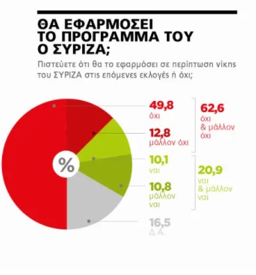 Σύμφωνα με την έρευνα, πάντως, το πρόβλημα αξιοπιστίας για τον ΣΥΡΙΖΑ είναι γενικότερο. Μόλις το 20,9% («ναι» 10,1%, «μάλλον ναι» 10,8%) περιμένει ότι θα εφαρμόσει το πολιτικό του πρόγραμμα σε περίπτωση νίκης στις εκλογές, ενώ το 62,6% («όχι» 49,8% και «μάλλον όχι» 12,8%) δεν το πιστεύει.