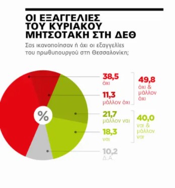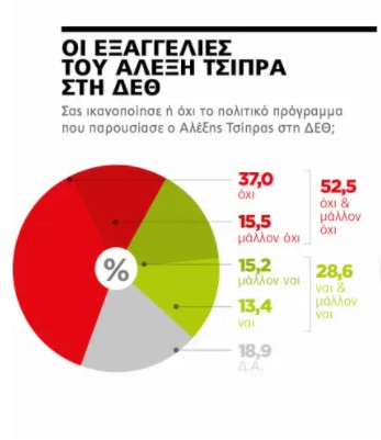 Ενδεικτικό είναι ότι η ικανοποίηση από τις εξαγγελίες του πρωθυπουργού έφτασε στο 40% («ναι» 18,3% και «μάλλον ναι» 21,7%), ενώ το αντίστοιχο ποσοστό για το πρόγραμμα που παρουσίασε ο αρχηγός της αξιωματικής αντιπολίτευσης έφτασε στο 28,6% («ναι» 13,4% και «μάλλον ναι» 15,2%). Οι εξαγγελίες του κ. Μητσοτάκη δεν ικανοποίησαν το 49,8%, ενώ οι αρνητικές γνώμες για τα όσα είπε ο κ. Τσίπρας είναι στο 52,5%.