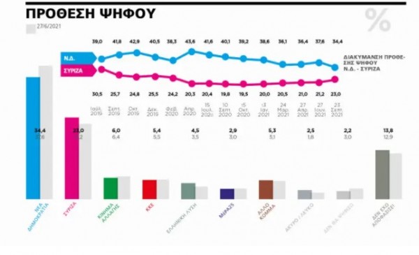 Στην πρόθεση ψήφου η ΝΔ συγκεντρώνει το 34,4% (έναντι 37,6% τον Ιούνιο), με τον ΣΥΡΙΖΑ να κερδίζει σχεδόν δύο ποσοστιαίες μονάδες και να φτάνει στο 23% (από 21,2%).