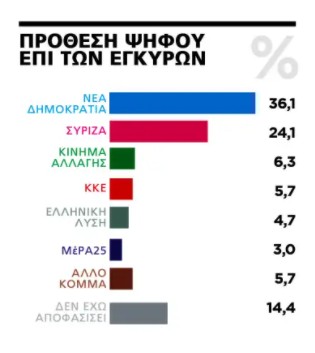 Ακολουθούν το ΚΙΝΑΛ με 6%, το ΚΚΕ με 5,4%, η Ελληνική Λύση με 4,5%, ενώ το ΜέΡΑ25 καταγράφει ποσοστό 2,9% και μένει οριακά εκτός Βουλής.