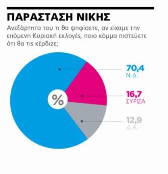 Στην παράσταση νίκης και στο ερώτημα «Ανεξάρτητα του τι θα ψηφίσετε, αν είχαμε την επόμενη Κυριακή εκλογές, ποιο κόμμα πιστεύετε ότι θα τις κέρδιζε;», η διαφορά είναι συντριπτική υπέρ της ΝΔ, την επικράτηση της οποίας πιστεύει το 70,4% έναντι 16,7% που εκτιμά ότι θα κερδίσει ο ΣΥΡΙΖΑ.