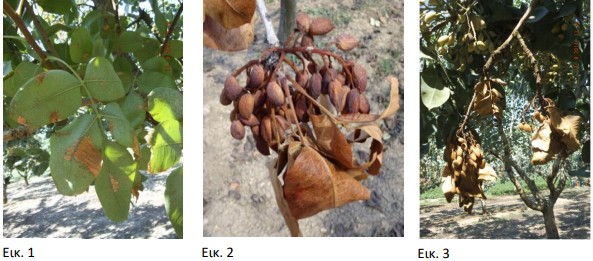 Τα συμπτώματα της ασθένειας Βοτρυοσφαίρια αυτή την εποχή είναι χαρακτηριστικά. Παρατηρούνται ξηράνσεις φύλλων (εικόνες 1 και 2), καρπών και ταξικαρπιών (εικόνα 2), καθώς και ολόκληρων κλάδων (εικόνα 3).