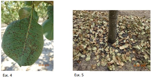 Σε δενδροκομεία που δεν ψεκάστηκαν επαρκώς κατά τη διάρκεια της καλλιεργητικής περιόδου ή δεν γινόταν σωστή κάλυψη των δένδρων με το ψεκαστικό υγρό οι προσβολές είναι έντονες και συνοδεύονται από φυλλόπτωση (εικόνες 4 και 5).