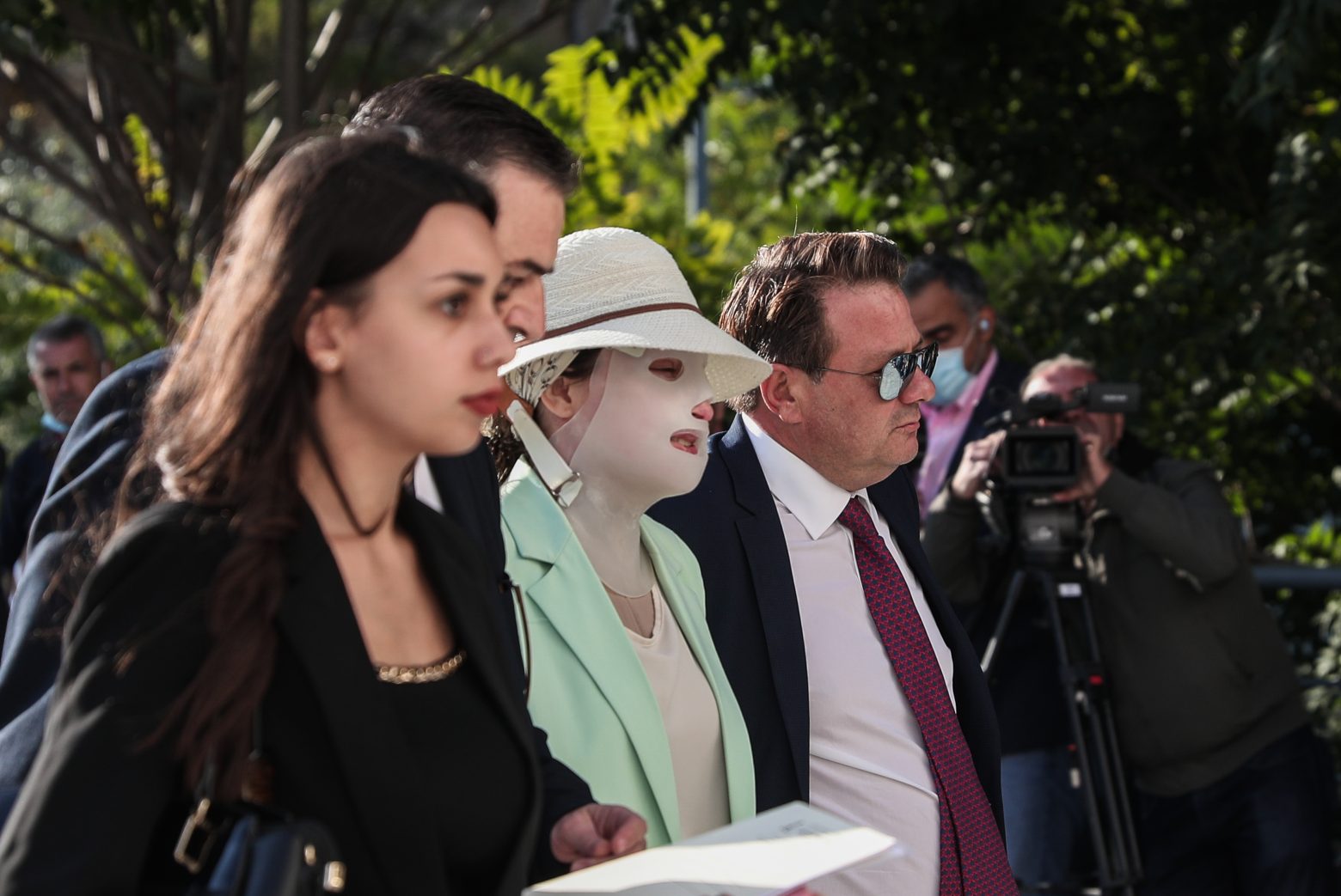 Με τη γνωστή μάσκα, ανοιχτόχρωμα ρούχα κι ένα μεγάλο καπέλο για να την προστατεύει από τον ήλιο, έπιασε τον δικηγόρο της από το χέρι και αμέσως κατευθύνθηκε στη δικαστική αίθουσα.
