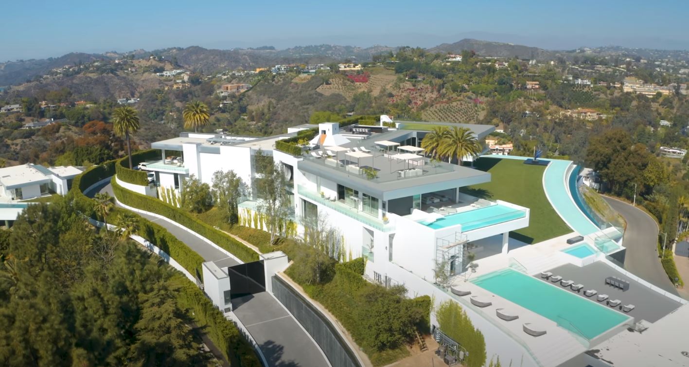 Η έπαυλη εκτείνεται σε 100.000 τετραγωνικά μέτρα, διαθέτει 21 υπνοδωμάτια, τέσσερις πισίνες, μία αίθουσα μπόουλινγκ και θέα 360 μοιρών πάνω από τη Νότια Καλιφόρνια.