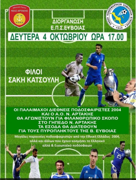 Ύστερα από πρωτοβουλία του 31χρονου θα διεξαχθεί ποδοσφαιρικός αγώνας με παλαίμαχους διεθνείς. Τα χρήματα που θα συγκεντρωθούν θα διατεθούν στους κατοίκους της Βόρειας Εύβοιας που είδαν τις περιουσίες τους να καταστρέφονται από τις πυρκαγιές.