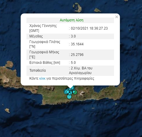 Μάλιστα, λίγα λεπτά αργότερα σημειώθηκε νέα σεισμική δόνηση μεγέθους 3 Ρίχτερ, με επίκεντρο τα 2 χλμ. βορειοανατολικά του Αρκαλοχωρίου και εστιακό βάθος τα 5 χλμ.