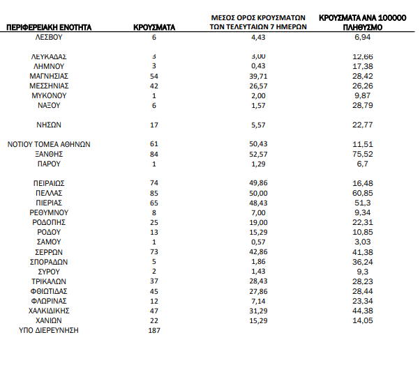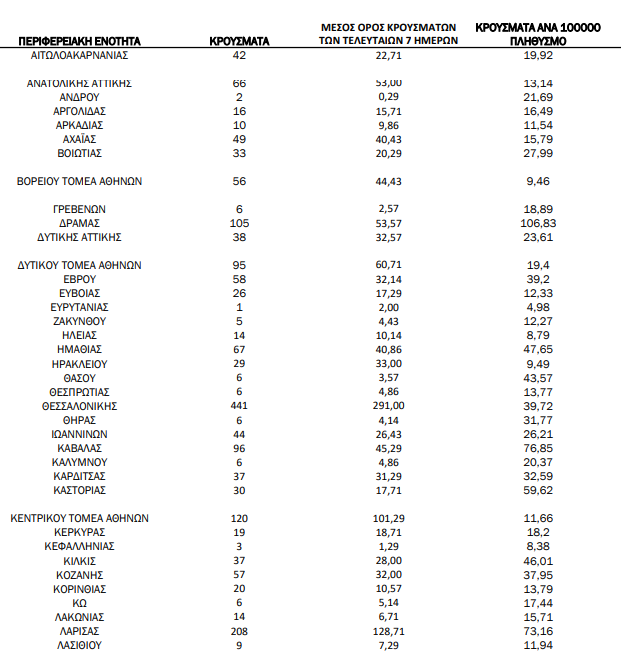 Ακόμα, 208 κρούσματα καταγράφει η Λάρισα, 105 η Δράμα, 96 η Καβάλα, 85 η Πέλλα και 84 η Ξάνθη.