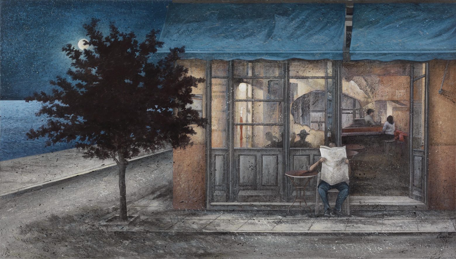 Καφενεία με φωτισμένες τζαμαρίες σαν γυάλινες οθόνες, με κατηφείς θαμώνες σαν θέατρο σκιών και γυναικείες παρουσίες με χρώμα, το οποίο τονίζει την γκρίζα αντρική μονοτονία. Προσόψεις σπιτιών με κυβίζουσα βυζαντινή διάταξη που διαμορφώνουν περίκλειστους χώρους χωρίς καμία ανθρώπινη παρουσία. Μοναχικά άτομα σε ανοιχτό χώρο, κυρίως φυσικό, με κάποιες ενδείξεις πολιτισμού όπως ένα παγκάκι, μια στάση λεωφορείου, ένα φανάρι δρόμου. ζευγάρια καθισμένα σε παγκάκι ή σε βαρκάδα σε νυχτερινή θάλασσα ή ακόμα ατενίζοντας ένα δέντρο με τη μορφή του δέντρου της ζωής. Και όλα αυτά διακατέχονται από συναισθήματα μοναχικότητας, μοναξιάς και ταυτοχρόνως από την αναμονή για μια συνάντηση.