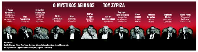 Στον μυστικό δείπνο συμμετείχαν εκτός του Αλέξη Τσίπρα και του στενού του συνεργάτη και εξ απορρήτων του (αλλά και με εικόνα και διαύλους με το Κίνημα Αλλαγής) Αλέκου Φλαμπουράρη. Ο βετεράνος του ΣΥΡΙΖΑ εξάλλου είχε φροντίσει και για το μέρος όπου θα γινόταν η σύσκεψη, αλλά και ως έναν βαθμό για την ανθρωπογεωγραφία της. Οι δύο εκ της γνωστής τρόικας των παλιών ήταν επίσης εδώ: οι Νίκος Βούτσης, Πάνος Σκουρλέτης, σημερινά στελέχη της Ομπρέλας και με βαρύνουσα γνώμη και με προνομιακούς διαύλους με την τάση των 53 και με μέρος της ΚΟ του κόμματος. Ο Ευκλείδης Τσακαλώτος (αρχηγός των 53 και στέλεχος Ομπρέλας, αλλά και ένας εκ των πόλων του κόμματος που συχνά υπενθυμίζει την πολιτική του αυτονομία – εσχάτως με καλή σχέση με τον Τσίπρα. Ως γραμματέας του ΣΥΡΙΖΑ, εδώ ήταν και ο Δημήτρης Τζανακόπουλος που πάντως έχει πλέον κανάλια επικοινωνίας και με την πιο αριστερή εσωτερική αντιπολίτευση, αλλά και με προφανώς καλή εικόνα από το κόμμα ανά την Ελλάδα.