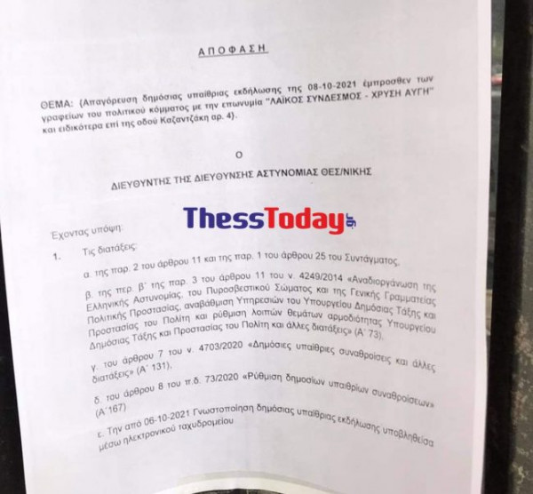 Όπως αναφέρει το thessotoday.gr, η αστυνομία ανάρτησε στην είσοδο του κτιρίου την εξής απόφαση: «Απαγόρευση δημόσιας υπαίθριας εκδήλωσης της 08/10/2021 έμπροσθεν των γραφείων του πολιτικού κόμματος με την επωνυμία “Λαϊκός Σύνδεσμος – Χρυσή Αυγή”».